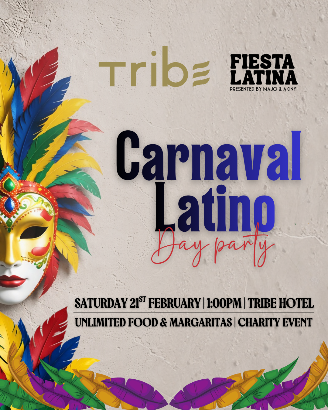Enjoy unlimited food and bottomless margaritas all afternoon as we dance, swim and soak up the Carnaval energy (Don’t forget your swimming costumes!)